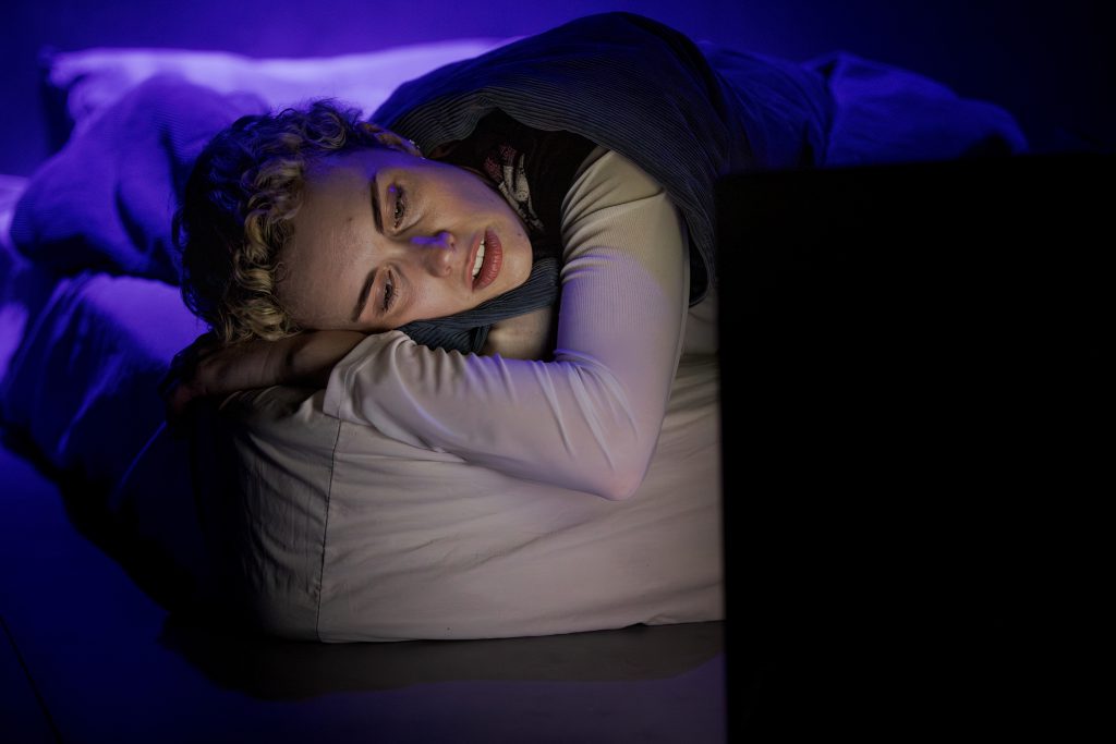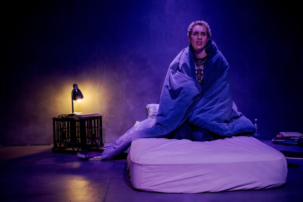 The audience enters KXT to find Gia (Stafford) moodily absorbed in a copy of Hamlet, surrounded by the many interpretations of the classic – reflecting the character’s intense dedication to the Bard. The staging, with the audiences seated on opposite sides, creates an immediate sense of exposure. This intimate configuration heightens the play’s emotional volatility, intensifying moments of confrontation and vulnerability.
