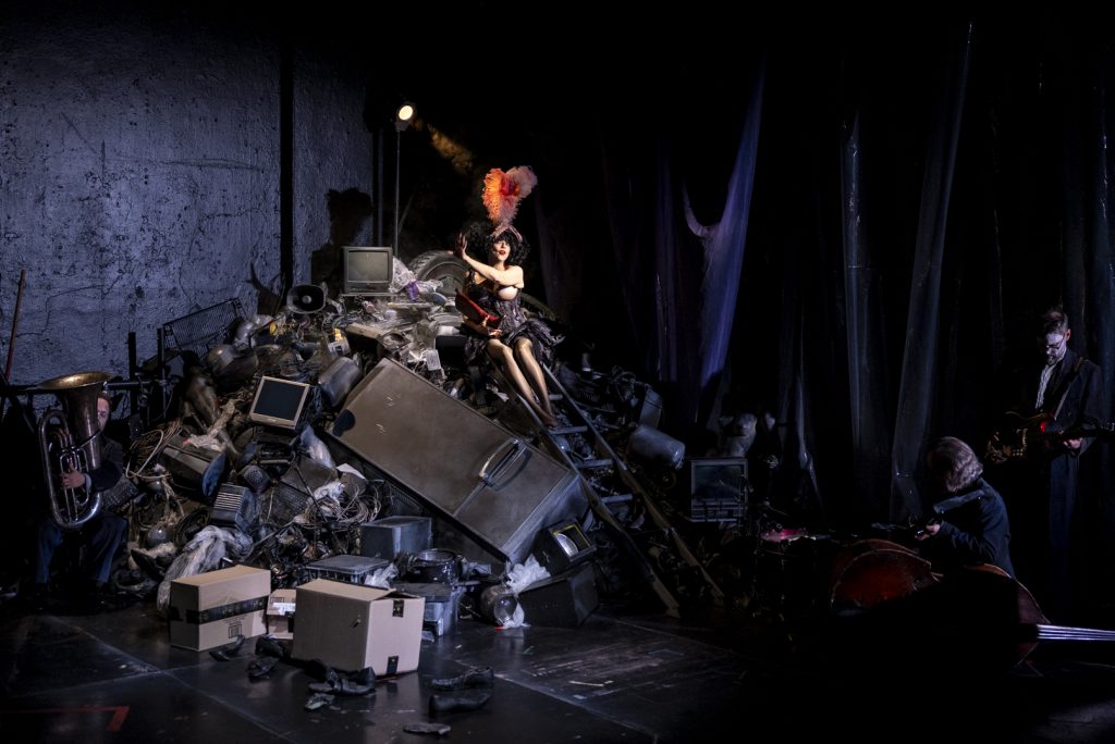At first glance, the set (designed by Dann Barber) feels oddly bleak—a mound of junk in one corner, a sheer plastic curtain across the back. But Meow Meow’s magnetic presence, astonishing vocals, and never-ending gags transforms the debris into a dazzling playground of cabaret magic.