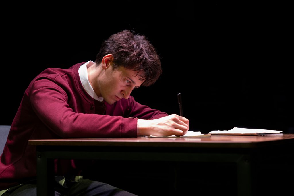 Parsons was excellent as the misfit teenage Darryl. Frequently funny in his mannerisms, Parsons brings a volatile, chaotic energy to the role that feels very familiar and yet deeply unsettling. Throughout his scenes, there is always an underlying unpredictability to his behaviour which keeps the audience on their toes. A particularly effective directorial touch lies in Darryl’s physicality; he never quite sits properly in his chair, instead swivelling it onto its legs, perching on the backrest or flipping it around in defiance of classroom etiquette.