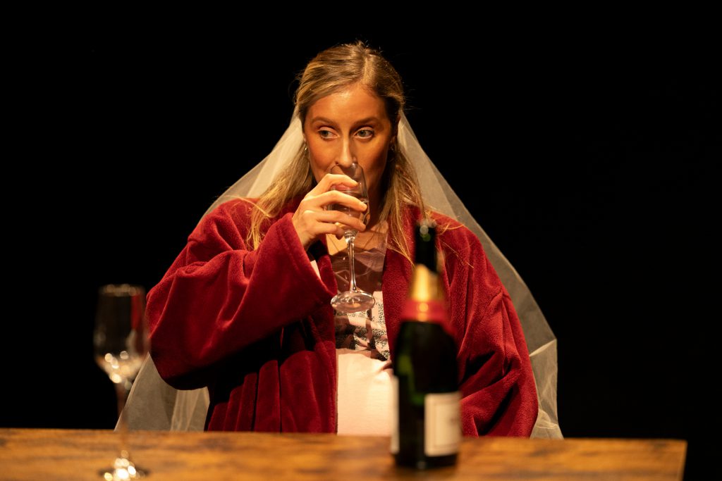 The set by Victor Kalka is minimal and simplistic: grey carpet, a table and two chairs, which although a touch drab, allows for the performances to take centre-stage. Sound design by Charlotte Leamon, supported by atmospheric lighting from Topaz Marley-Cole, maintains the play’s sense of unease, where black-out transitions are accompanied by the disturbing echoing soundscape of harmonised voices, distant screams and low grumbling tones.