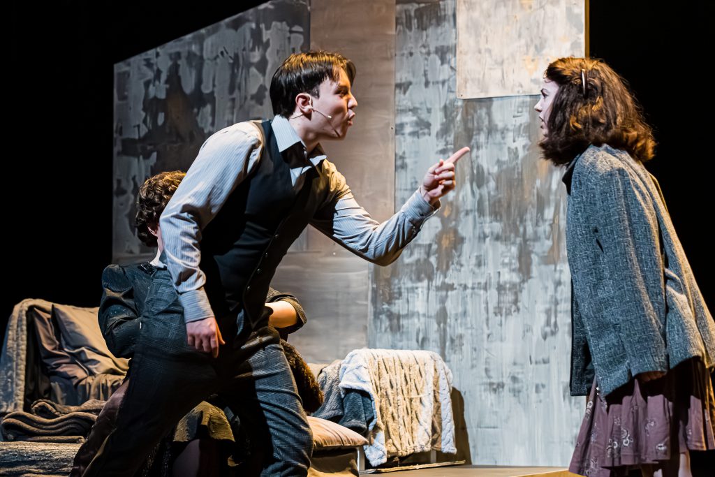 This play was exceptionally cast across vastly different characters and was also a study in contrasts. An organic and energetic Anne contrasted with the brooding Peter Van Daan (Nathan Hampson), her humble sister Margot (Emma Smith), and the stilted Jan Dussel (Jamie Jewell). The uncontained Putti (Matt Dyktynski) and Petronella Van Daan (Asha Cornelia Cluer) and the contained Otto and Edith Frank (Holly Easterbrook). The younger Miep Gies and the older Mr Kraler (Kingsley Judd).
